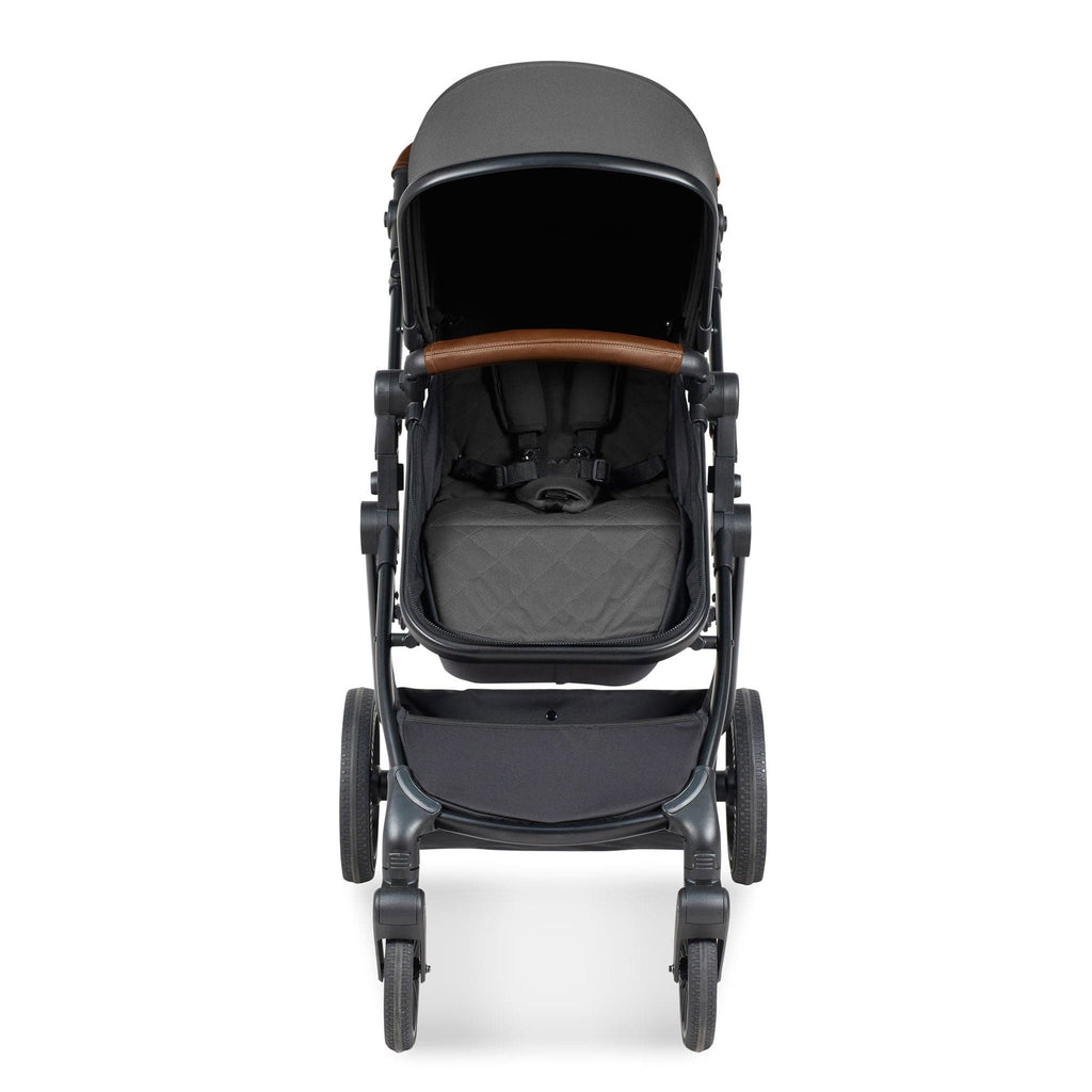 Cosmo looks the part too. Whether you choose the matte black or gunmetal frame, you’ll enjoy a sleek, modern finish paired with a comfy leatherette handle. Inside, soft luxury fabrics, a cosy fleece-lined footmuff and a protective apron with privacy panel keep your tiny passenger warm and settled whatever the weather decides to do.