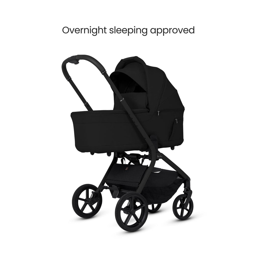 Overnight sleep-approved folding carrycot with soft-touch bamboo-lined mattress and panoramic ventilation